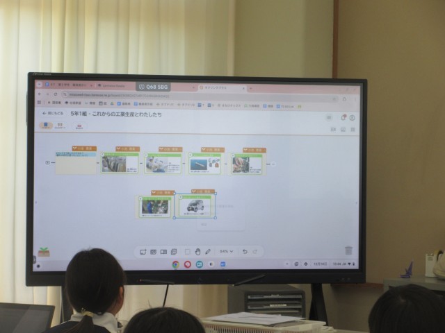 5年生は、これまで「工業生産」について学んできたことをもとに、消費者や生産者の立場から日本の工業の発展について考えました。発展に欠かせないと思ったものBest3をピックアップし,更にNo.1だと考えた項目については、なぜそのように考えたのか根拠を明らかにして、タブレット内のカードにまとめました。一人一人が自分の考えをもち、グループの友だちと意見交流をすることができました。
