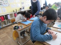 書道家の先生を講師に招いて、書き初めについての講話をいただき、子供たちは気持ちを引き締めて書き始めました。