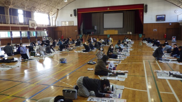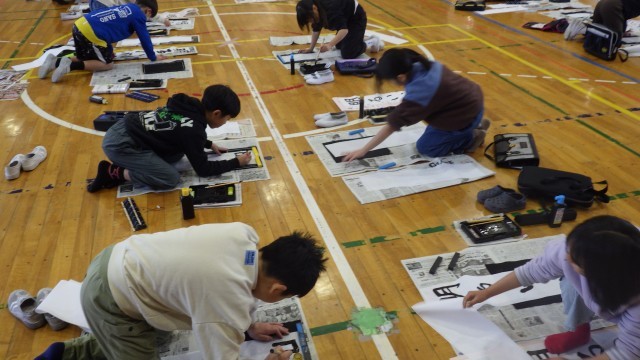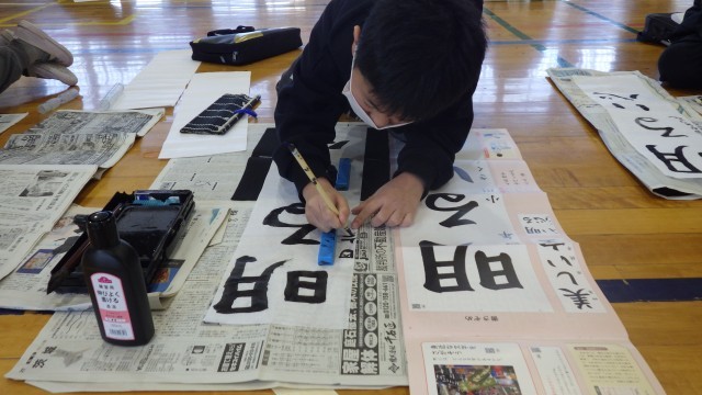 写真は、4年生の書き初め会の様子です。
