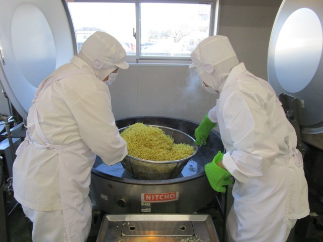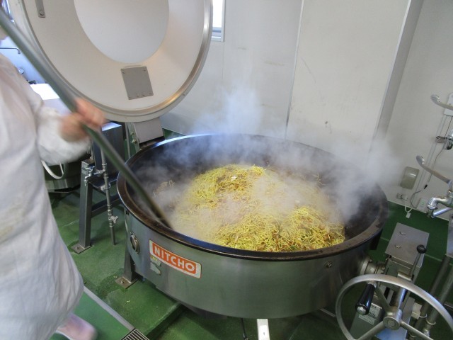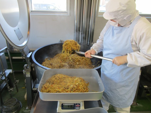 給食室で焼きそばを作っている様子です。