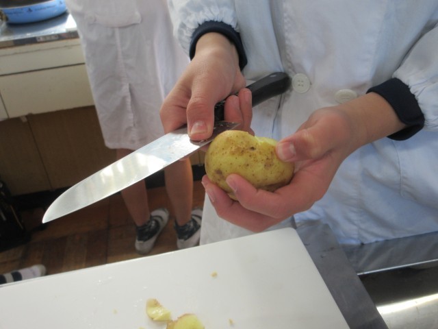 写真の1.2.3枚目は、6年生「家庭科」調理実習の様子です。ジャガイモの皮を慎重に、恐る恐るむいていました。