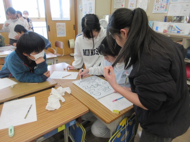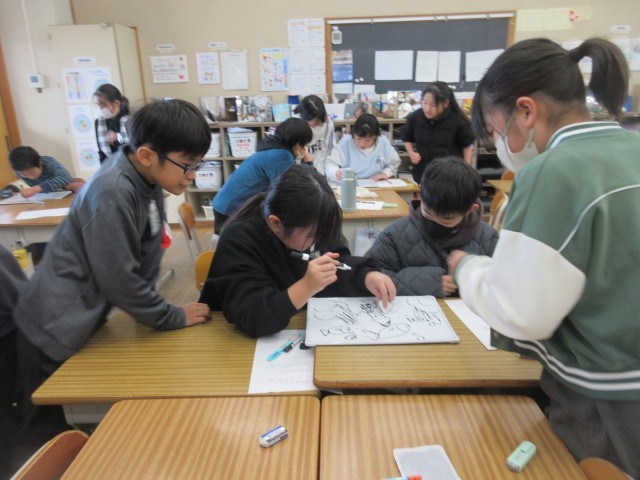 写真の7.8.9枚目は、5年生「学級活動」SSTイラスト伝言ゲームの様子です。絵を見て伝える担当者が、グループの友達に見た絵日付いて伝え、ヒントを聞いたメンバーが絵に表していくゲームです。しっかり伝え、しっかり聞き取ることを協力しあう「ミュニケーション能力を高める」活動を行っていました。