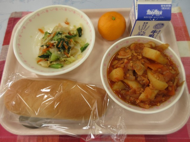 【献立】はちみつパン 牛乳 ポークビーンズ こんにゃくサラダ ぽんかん
