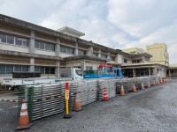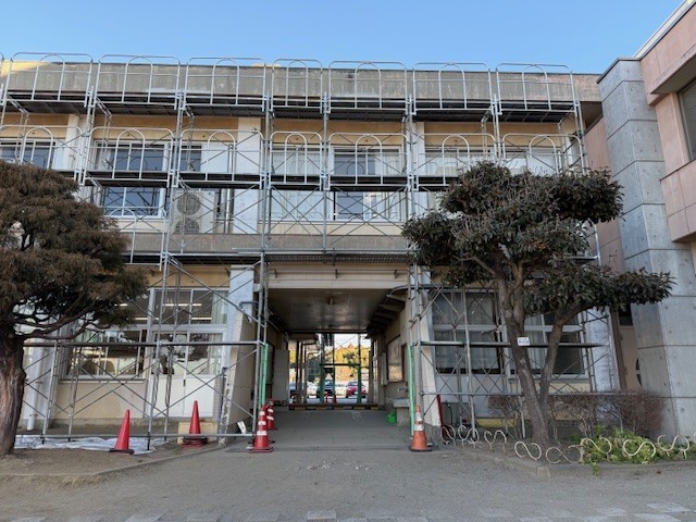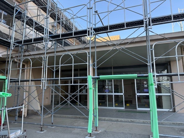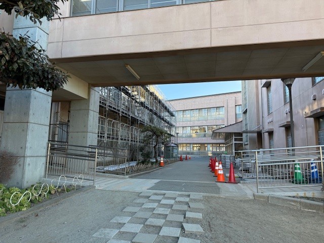 また、4年生昇降口周辺も足場で覆われています。旧校舎側からグランド方面に、通り抜けをしていた通路もかなり狭くなっています。
