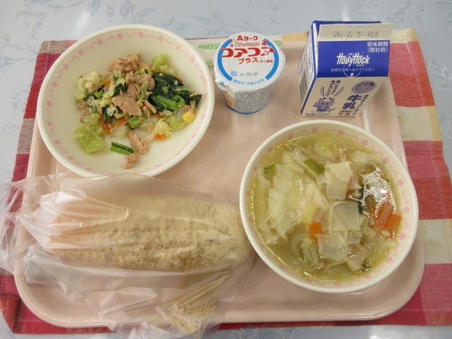 【献立】きなこ揚げパン 牛乳 ツナサラダ ワンタンスープ ヨーグルト