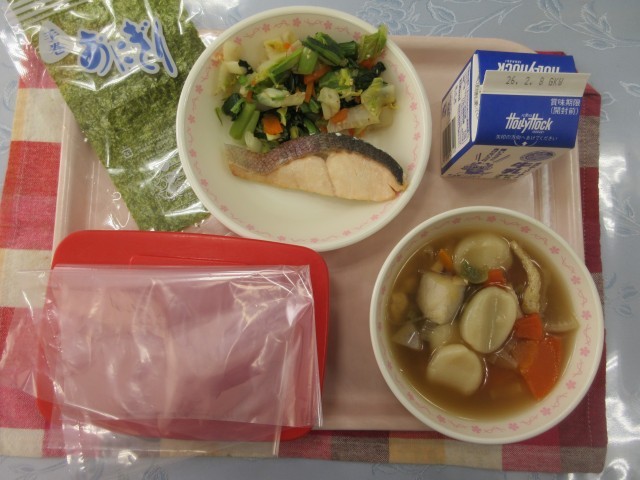 【献立】ごはん やきのり 牛乳 鮭の塩焼き 即席漬け すいとん汁