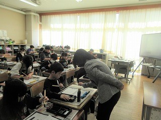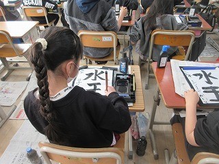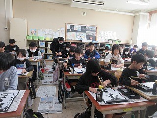 今年度3年生は、初めての毛筆なので、正しく道具の使い方や手入れの仕方を学び、筆の運び方をマスターして、手本のような文字を書けるように、GTの先生方と一緒に学習を進めてきました。おかげで、かなり上達しました。