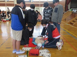 AEDの使い方、心肺蘇生の2種類の一時救命措置について学びました。