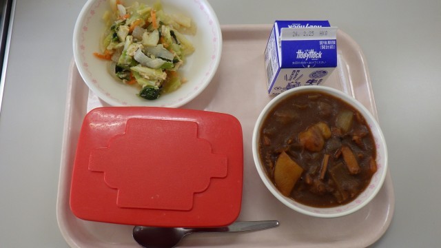 【献立】ごはん 牛乳 湊のいかカレー こんにゃくサラダ