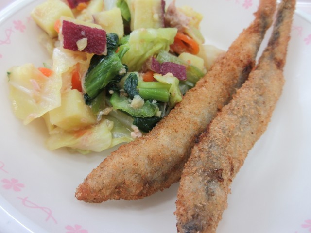 【献立】キムタクごはん 牛乳 ししゃもフライ さつまいも入りオニオンドレッシングサラダ
