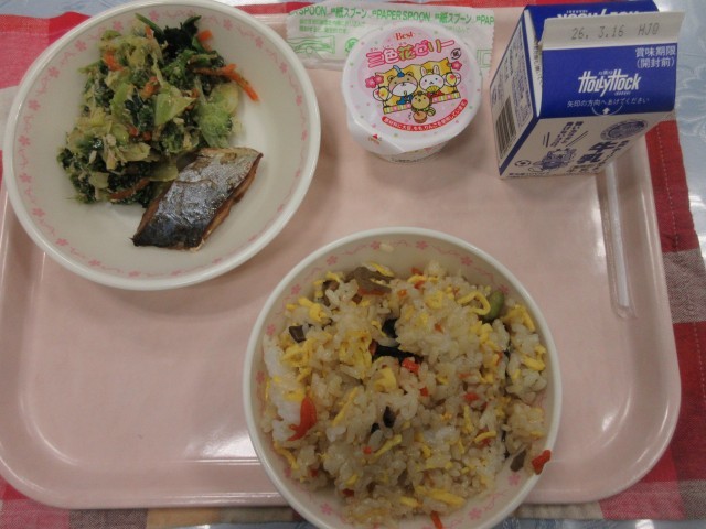 【献立】五目ちらし寿司 牛乳 さわらのすだちしょうゆ焼き 菜の花のごまあえ 三色ゼリー
