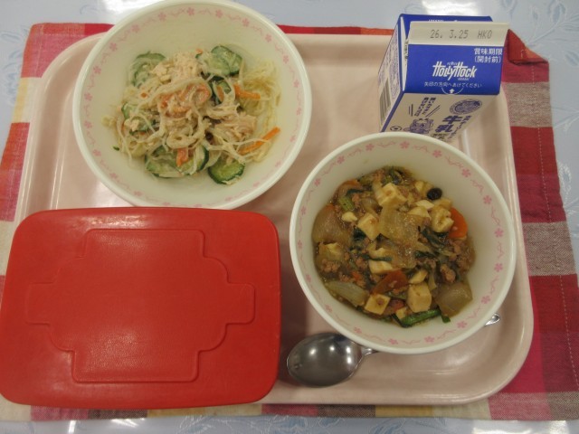 【献立】ごはん 牛乳 四川風麻婆豆腐 バンバンジーサラダ