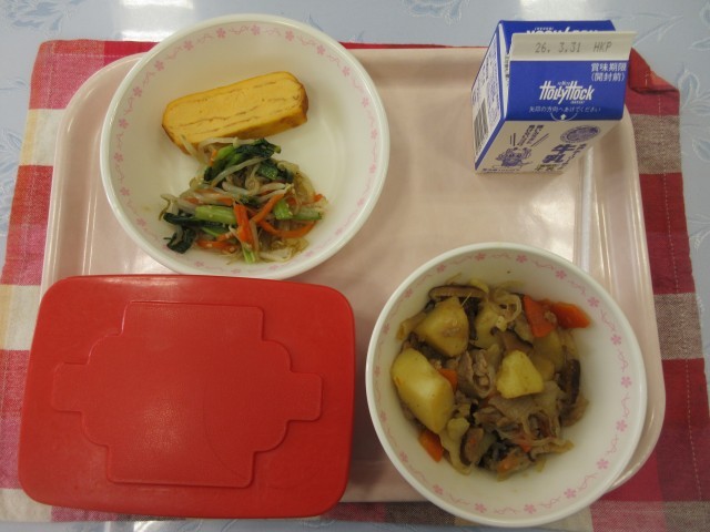 【献立】ごはん 牛乳 厚焼きたまご ピリ辛肉じゃが ナムル
