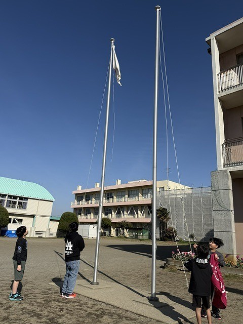 昨年度末に、引き継いだ国旗当番。新6年生として、最初のお仕事。国旗・校旗を揚げてくれました。