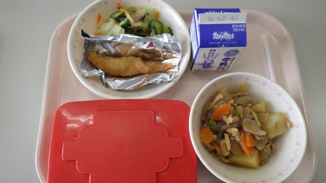 【献立】ごはん 牛乳 ししゃもフライ チンゲンサイの酢じょうゆあえ 肉 じゃが