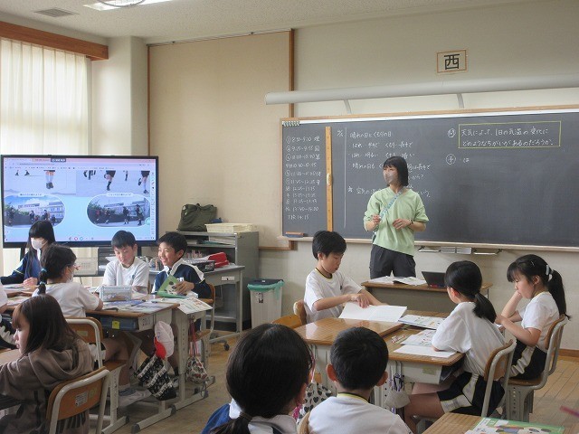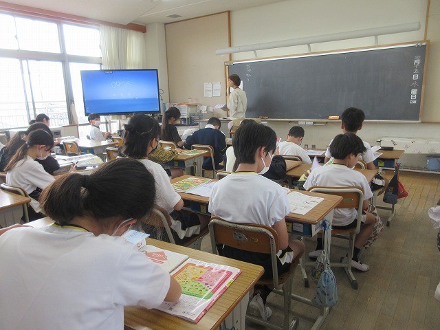 5年生は、新しく教科に加わった家庭科の学習をしていました。家庭にはどのような仕事があるのか、「食べることに関すること」「着ることに関係すること」「住まいのことに関すること」「その他」に分類して、家庭生活について学び始めていました。
