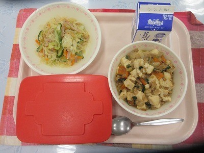 【献立】ごはん 牛乳 麻婆豆腐 バンサンスー