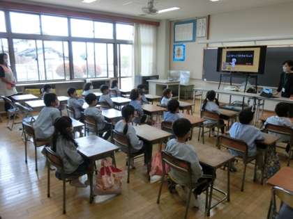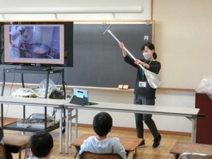 助川栄養教諭が給食を作る様子を説明したり、実際の道具を紹介したりしました。