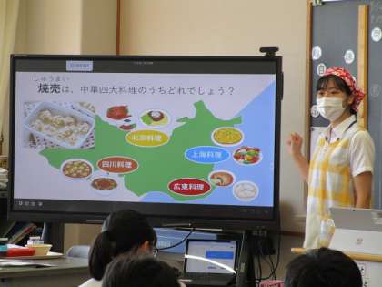 今週は、栄養教諭の実習生が来ています。今日は、6年2組で給食時の指導を行いました。中国四大料理とその特徴についてお話ししてくれました。今日のポークしゅうまいとチンジャオロースはどの地域の料理か、クイズをしながら食べました。とても勉強になりましたね。