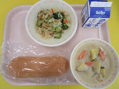 〈献立〉コッペパン 牛乳 さつまいもの米粉シチュー 寒天入りヘルシーサラダ