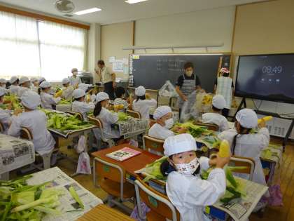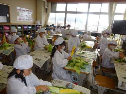 2年生が、民生委員さんにお世話になり、とうもろこしの皮むき体験を行いました。