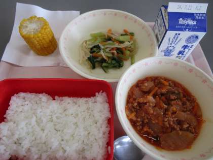 〈献立〉ごはん 牛乳 タコライスの具 もやしサラダ ゆでとうもろこし