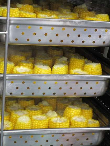 今日は、ひたちなか市産のとうもろこしを付けました。2年生が皮むきをした後、給食室で3等分にカットし、機械で蒸しました。朝4時に収穫したばかりのとうもろこしで、甘味があってとてもおいしかったです。