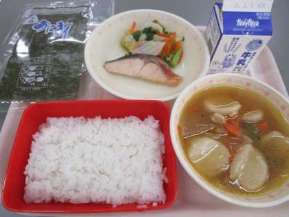 〈献立〉ごはん のり 牛乳 鮭の塩焼き 即席漬け すいとん汁