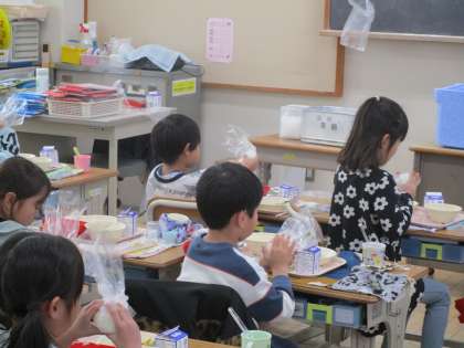 1月24日〜30日は、全国学校給食週間です。今日の給食は、学校給食が始まった頃をイメージした献立にしました。昔はおにぎりだったことから、今日は自分でおにぎりを作って食べました。1年生は初めてだったので、作るのに少し時間がかかりましたが、楽しそうに食べていました。2年生以上は、去年も一度やっているので、上手に作ることができていました。さすがですね!