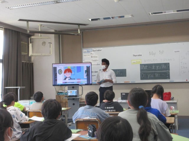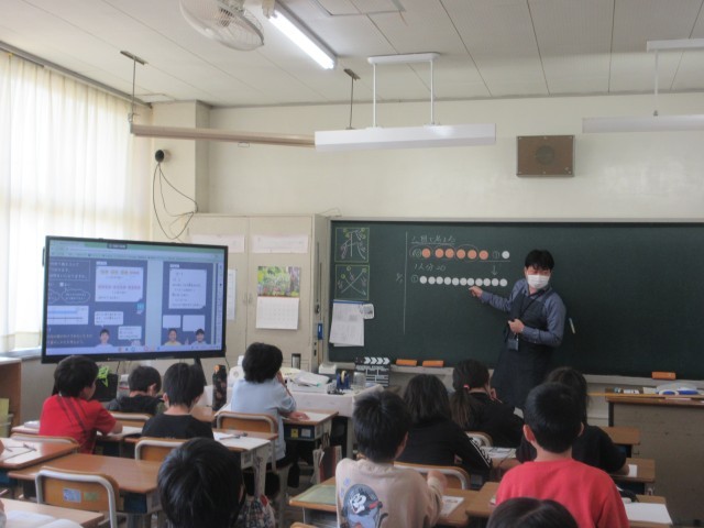 写真は、2年生・4年生「算数」、3年生「国語(タブレットの活用)」、5年生「外国語」の学習のようすです。