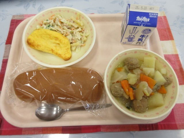 【献立】はちみつパン 牛乳 オムレツ マカロニサラダ 肉だんごと野菜のスープ煮