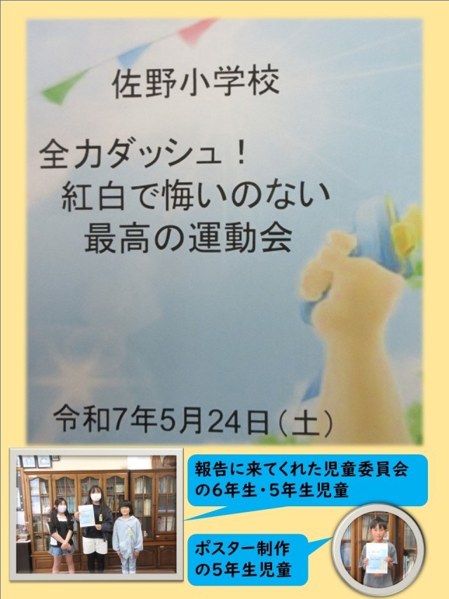 来週から運動会の練習が始まります。また、本日昼休みに、児童委員会の委員長さんと委員の児童が、校長室に「運動会のスローガン」が決定したことを報告に来ました。