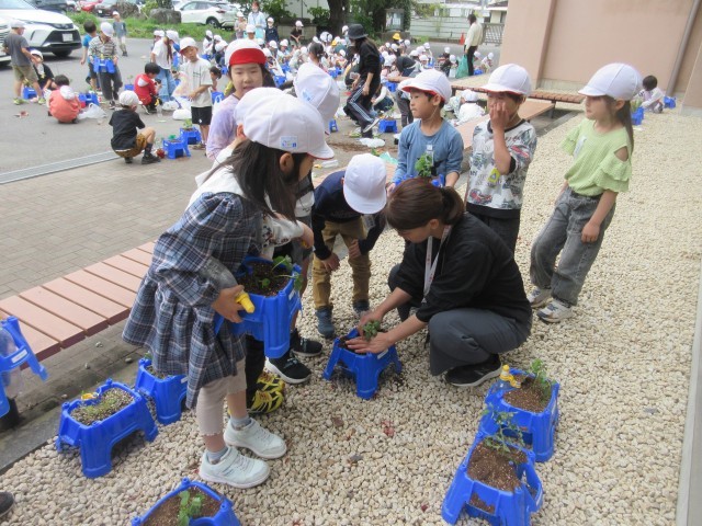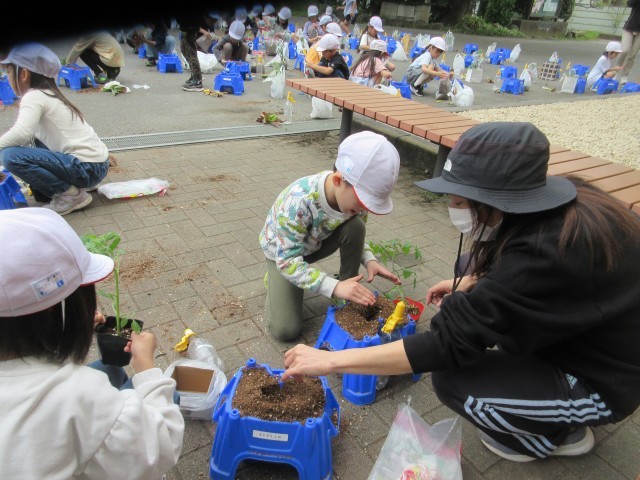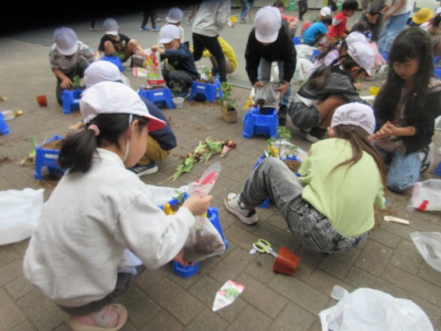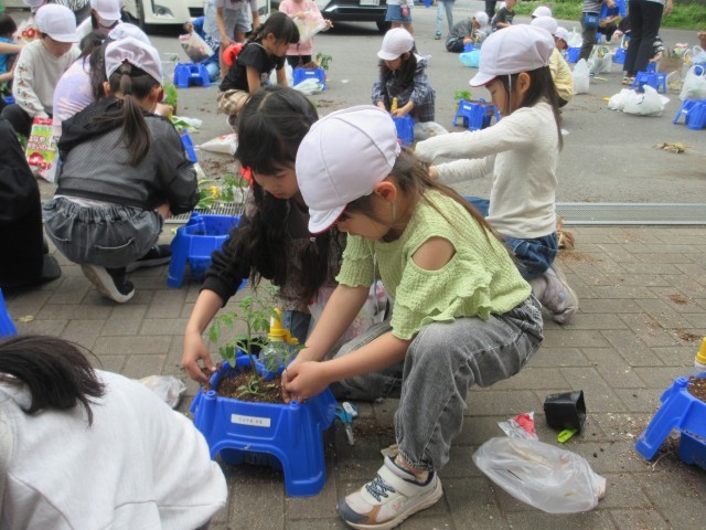 活動開始前に、先生の説明をよく聞いて、友達と協力しながら、鉢に植え作業に取りかかりました。
