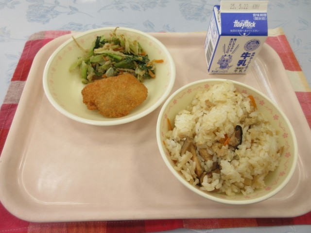 【献立】こぎつねごはん 牛乳 もうかフライ ごまあえ