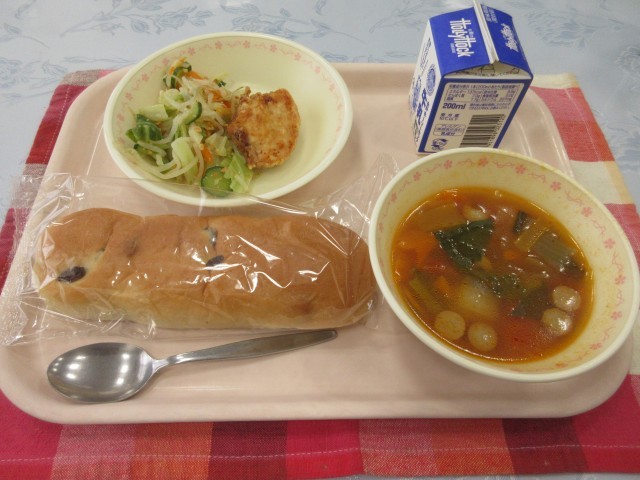 【献立】レーズンパン 牛乳 米粉のフライドチキン カリカリ大豆サラダ ミネストローネ
