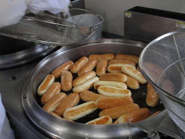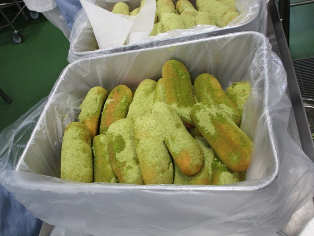 揚げパンは、給食室で1つ1つていねいに揚げ、抹茶パウダーをまぶして仕上げ、子供たちに提供しています。