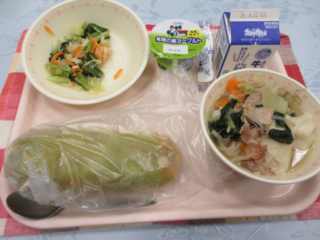 【献立】抹茶きなこ揚げパン 牛乳 レモンドレッシングサラダ ワンタンスープ ヨーグルト