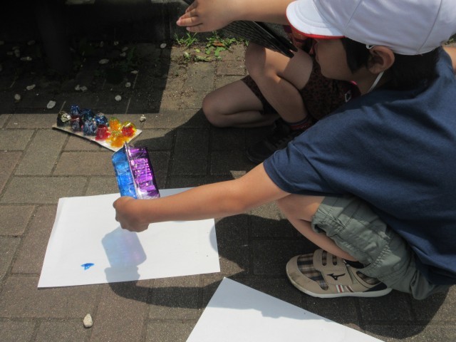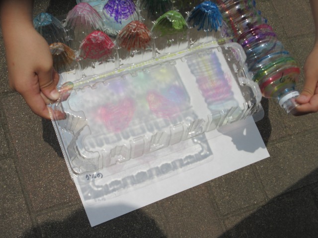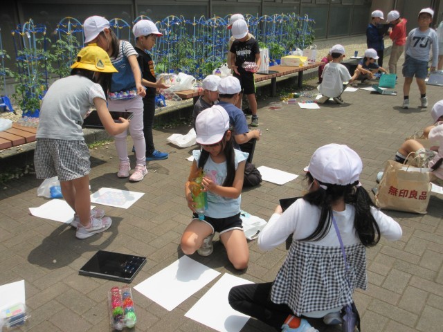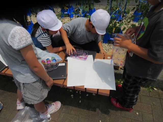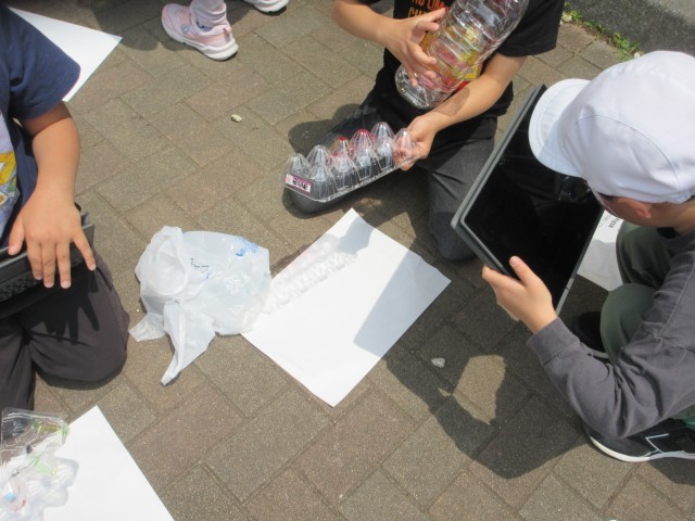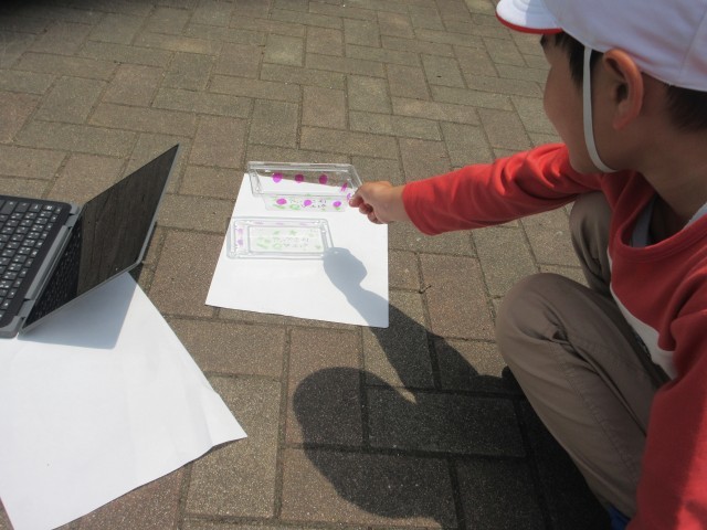 「ひかりのプレゼント」は、プラコップやたまごパックなどの身近にある光を通す透明のプラスチック廃材を使って、好きな色や形を映し出し、様々な見え方や感じ方と楽しむ学習です。子どもたちは各家庭から持ってきたプラスチック廃材にサインペンで色をつけたり、模様を描いたり、さらに水を入れたりして、太陽の光を当てて画用紙に映していました。きれいに映し出された光の影を、互いにタブレットで撮影し合っていました。