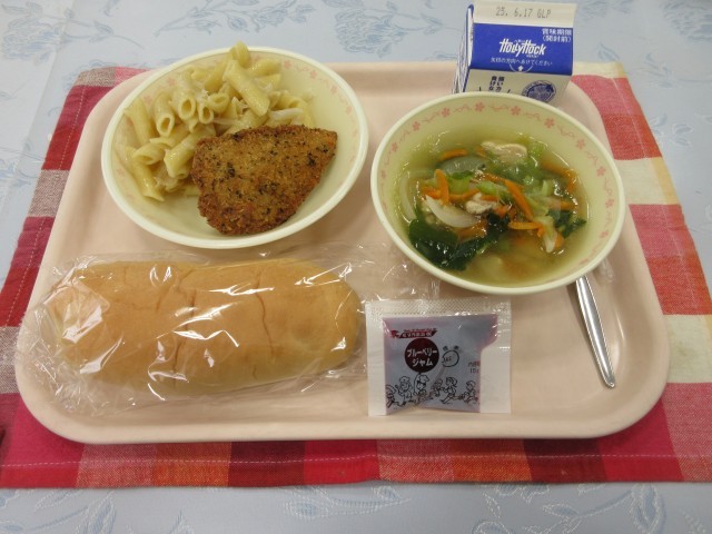 【献立】コッペパン ブルーベリージャム 牛乳 白身魚のバジルフライ ペンネソテー レタスのスープ