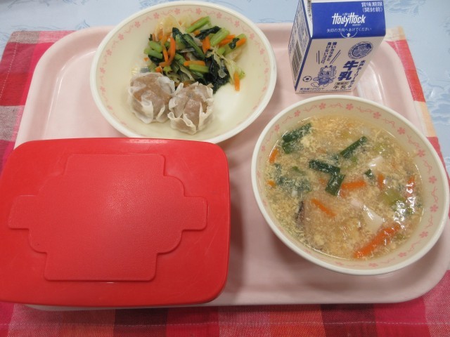 【献立】ごはん 牛乳 しゅうまい 小松菜のナムル 卵スープ