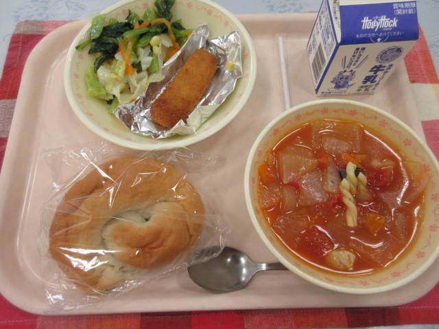 【献立】米パン 牛乳 おさかなソーセージフライ コーンサラダ 具だくさんトマトスープ