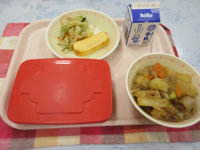 【献立】ごはん 牛乳 厚焼き卵 おひたし じゃがいものそぼろ煮