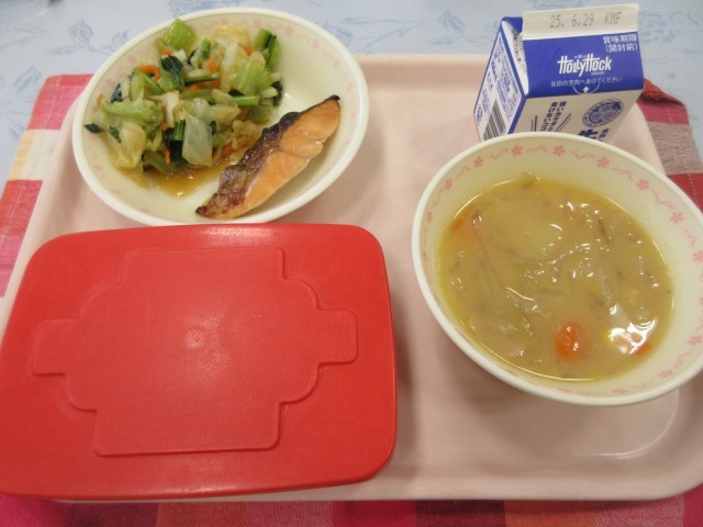 【献立】ごはん 牛乳 鮭の照り焼き 小松菜とキャベツのあえ物 どさんこ汁