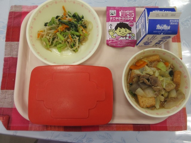 【献立】ごはん おかかふりかけ 牛乳 豚肉と厚揚げのみそ炒め わさびあえ