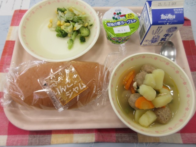 【献立】コッペパン 牛乳 りんごジャム ブロッコリーのサラダ 野菜と肉団子のスープ煮 ヨーグルト