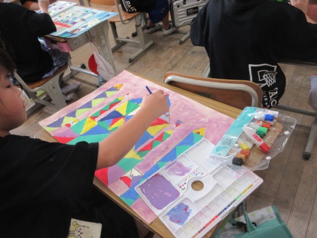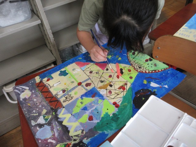下書き段階では、子供たちは「どう表現しよう?」と迷っていましたが、色づけが始まると創作意欲が全開です!