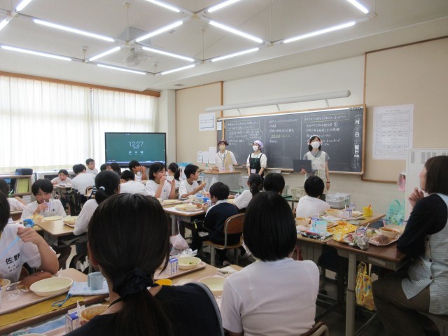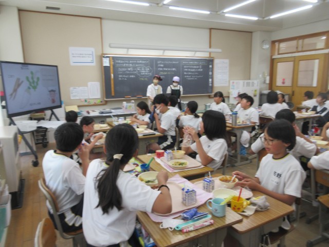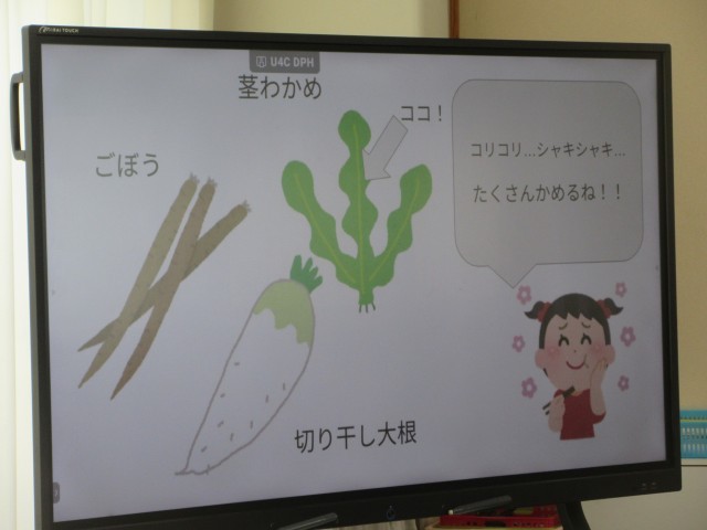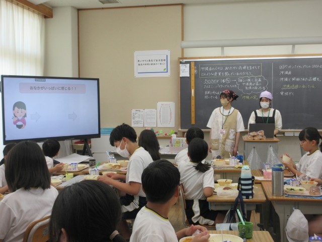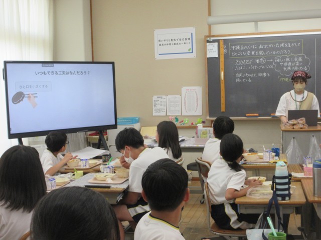 5年生の児童に向けた「よくかんで食べる」の栄養指導の様子です。給食を食べながら聞いている児童に、分かり安く伝えるためのプレゼンシートも実習生が作成しました。