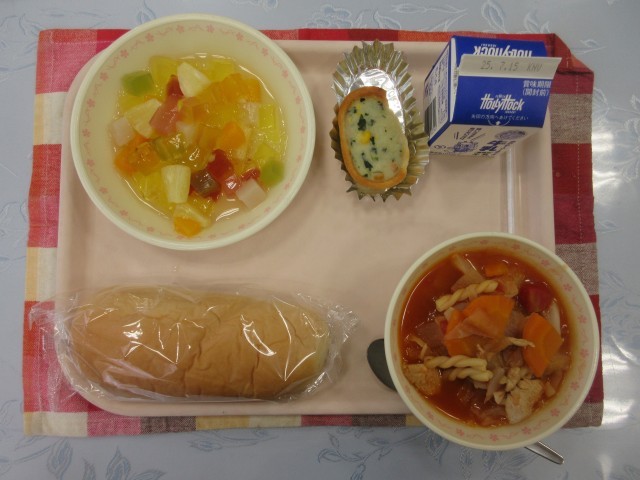 【献立】ガーリックチーズトースト 牛乳 肉団子とマカロニのトマト煮 湘南ゴールドフルーツポンチ