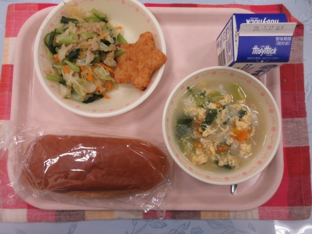 【献立】ミルクパン 牛乳 星型コロッケ 寒天入りヘルシーサラダ 星のたまごスープ