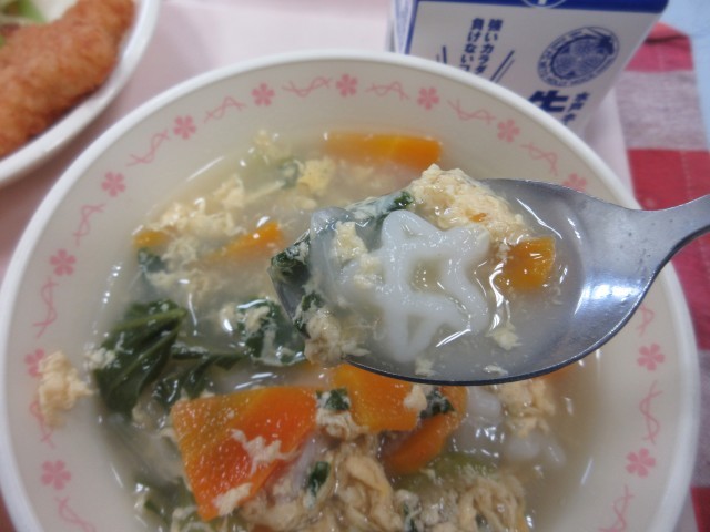 。星型のコロッケとスープに星型の米粉マカロニを使いました。七夕の夜は天の川をはさんで離れ離れになっている「織姫」と「彦星」が年に一度だけ会える日です。また短冊に願いを書いて笹に飾ります。年に一度の献立です。おいしくいただきましょう。
